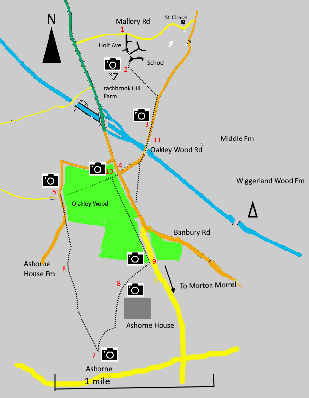 This 5 mile walk takes you down through Oakley Woods where you turn towards Ashorne, you then climb to Ashorne Park the highest point nearby and back through Oakley Wood.