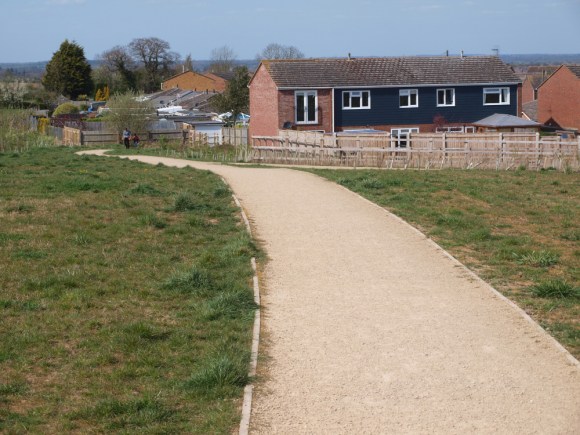 2. A short walk brings you to a high point with Oakley Meadows houses on your left and a good panorama of the local countryside (try and spot the Chesterton Windmill). Walk parallel to the houses down to the gate that leads you on a path that runs alongside Oakley Wood Road