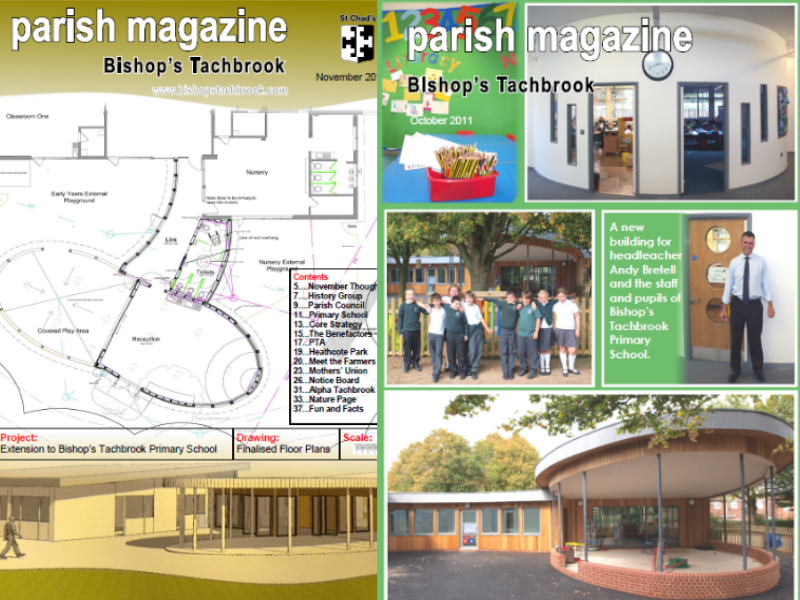 These two front covers record the extension to the Bishops Tachbrook C of E primary school. November 2010 shows the architects plans and Oct 2011 Andy Bretell gave me a tour of the smart new facility. Click the title to see further pictures